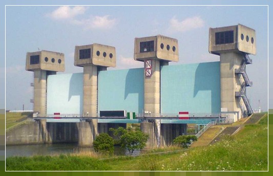 青い岩淵水門と、赤い旧岩淵水門が並んでいます。その横の河原は広くて気持ちの良い原っぱです。