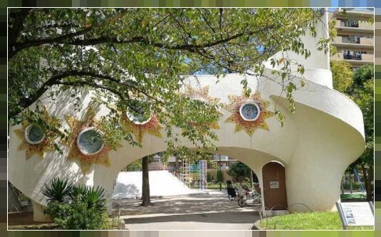 キリンの滑り台がある小さな公園部分と、噴水と時計台がある広場、滑り台や砂場のある公園部分の三つに分かれています。噴水のある広場は春秋の植木市やフリーマーケットなどが行われます。